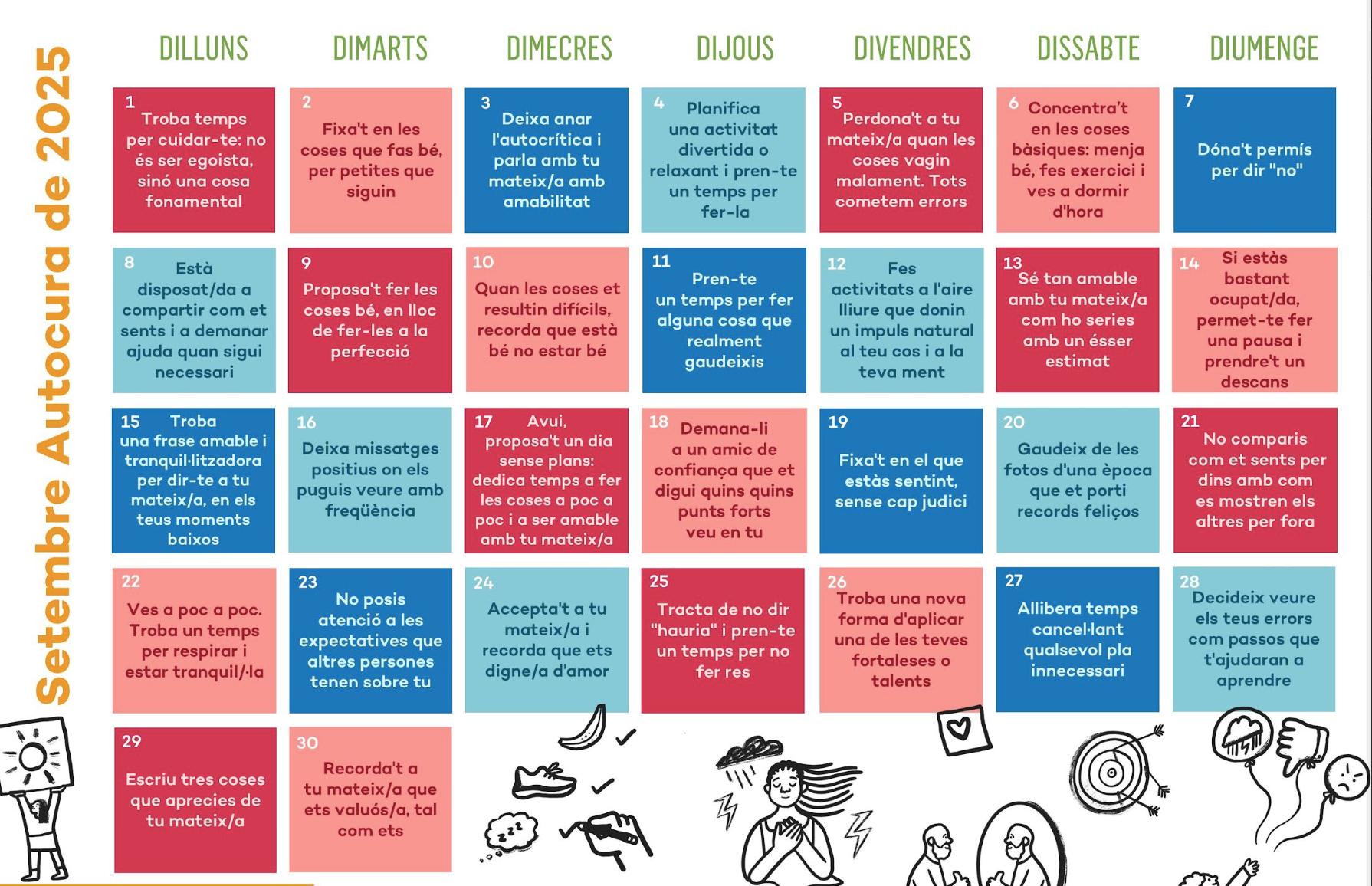 Després de fer TRIBU durant el setembre hem volgut incorporar a la programació setmanal algunes de les propostes d’Actions for hapinnessAquesta és una organització global sense ànim de lucre que té com a objectiu principal promoure una societat més feliç i solidària. La seva filosofia es basa en la idea que la felicitat individual i col·lectiva no depèn tant de les circumstàncies externes, sinó de les nostres accions i actituds diàries. El moviment anima les persones a prendre decisions i realitzar accions concretes que augmentin el seu propi benestar i el de la gent que els envolta. Amb el lema del curs com a eix vertebrador (“Si canvies la mirada, canvies el món”) hem començat per aprendre a mirar-nos diferent: planificant una activitat divertida i relaxant regalant-nos un moment per fer-la, escollint una frase afectuosa i encoratjadora pels mals moments o escrivint tres coses bones d’un mateix. Us animeu a triar alguna de les idees del calendari per cuidar-se a un mateix i compartir-la en família?
